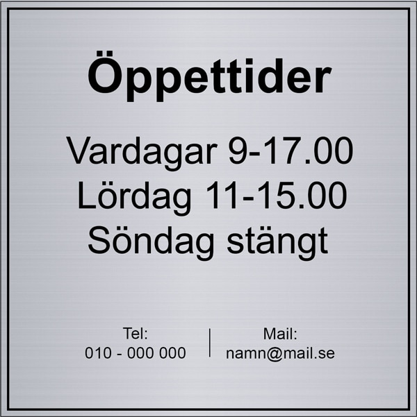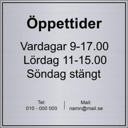 Skylt i aluminium med öppettider och kontaktuppgifter. Kontakta oss för egen text och design: info@skyltdax.se eller på telefon: 010-101 59 90