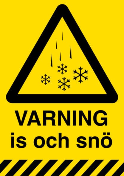 Varningsskylt med texten Varning för is och snö med varningsmarkering i tålig plast. Montera våra varningsskyltar enkelt på vägg eller stolpe. Skylten visar tydligt varning för risk för snöras och istappar.